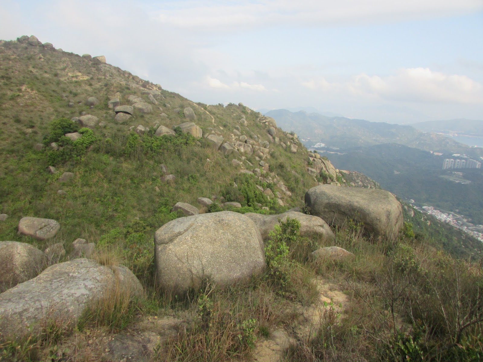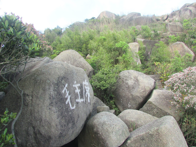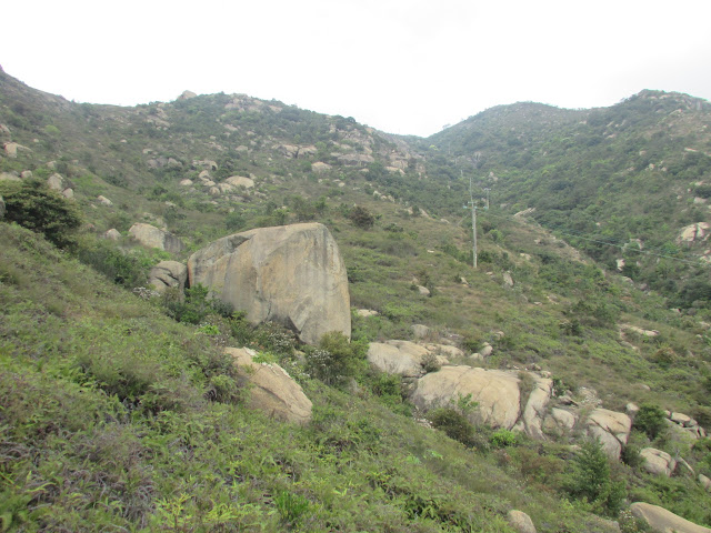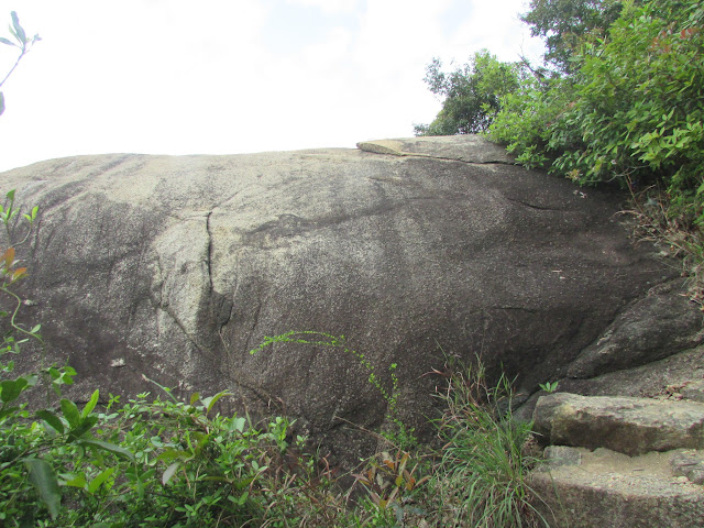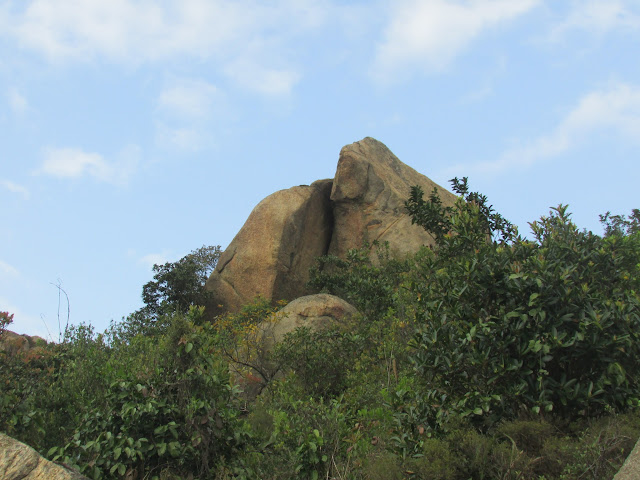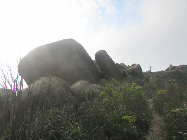 上山途中有不少歧路,路邊間中可見奇石,而且部分的體積還相當大,可是未適應春末的溫度之緣故,加上又處密林,已感到體力消耗得很快,最後在其中一處巨石觀景台上停下休息,欣賞山下屯門新市鎮的風貌,順帶為身體稍為降溫,至於傳說中的「飛來石」就找不著了。