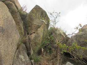 原路返回屯門健身徑,之後繼續在引水道畔馬路南行,旁邊當然有些健身設施。一直南下至M194標距柱對面上山,並尋找「拳頭石」和「孔子石」,當看見「拳頭石」後續上行至「孔子石」時發現斜度越來越高,所以「孔子石」亦無法近觀,接著取道西南脊直上九逕山,途中還可近望「癩蛤蟆石」及「狗仔石」,算是獲得個「幸運獎」。