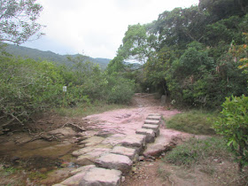 依「荔谷古道」上行至分水坳,之後再下達荔枝窩,乃完整的石磴古道,需時約一小時,但沿途頗為潮濕,遊人應多加留意,避免在岩石上滑倒了。抵達荔枝窩時已是兩點多,遊人開始減少,例牌在露天士多叫雞粥及豆花,可是是日天氣較預期熱,所以還要多買一支水。