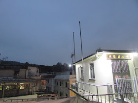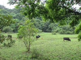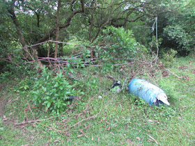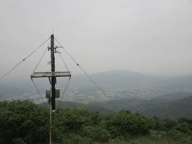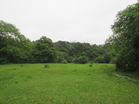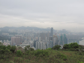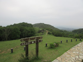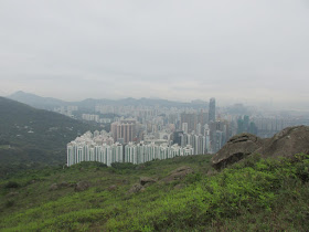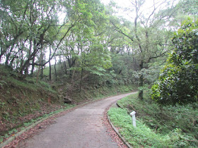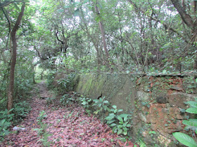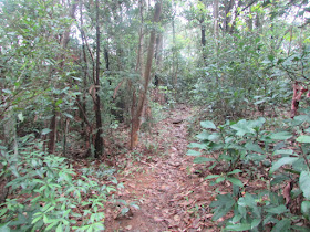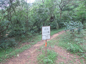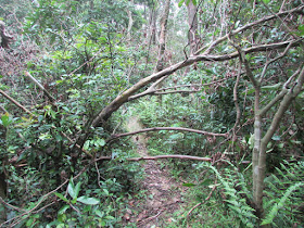 探過洞口,朝東北小徑往麥徑九段,此段路況更為崎嶇,部分位置窄如棧道,攔路塌樹數量遠比前年走過時為多,或許是被閃電或去年兩度八號風球時塌下,相信在強風或雷雨下走此段是極為危險的。轉出麥徑馬路後朝右走約十分鐘,在M161標距柱附近上行至「鱷魚朝天」山崗,山頂是一處平坦草地,以欣賞元朗錦田、八鄉及石崗群村為主,可惜能見度又較剛才為差,風景變成一片灰暗。林中有處無明顯路胚的地方,竟有幾支簇新引路帶,似乎落「飛鵝搶斗脊」的新闢小徑,但環境濕滑及非常陡斜,所以沒走此徑落河背,改由旁邊明路回麥徑,再東行至電訊坳附近落白石橋。