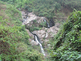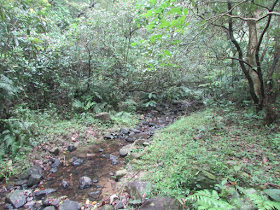 從荃景圍起步,穿過潭頂新村外圍(村口有座露天停車場),路邊不時可見曹公潭瀑布,雖然水量仍不高,但雨後已有其可觀之處。回走小段,經樓梯上行至引水道,該樓梯走訪人數不多,級上布滿落葉,到中段變成天然泥路,真的不明白署方為何修到一半就沒修,可能原本只是昔日通往民居的路。此路在三年前的秋天走過,當時林裡竹葉草(類似鬼針草的東西)處處,只走了幾分鐘,褲管就黏滿竹葉草種子,十分恐怖,幸好現時不是秋季,自然不會遇上它們了。
