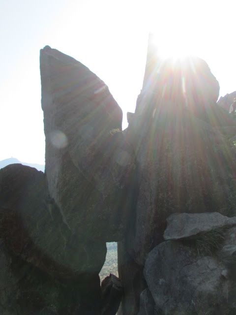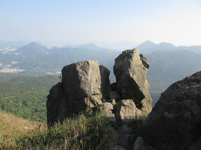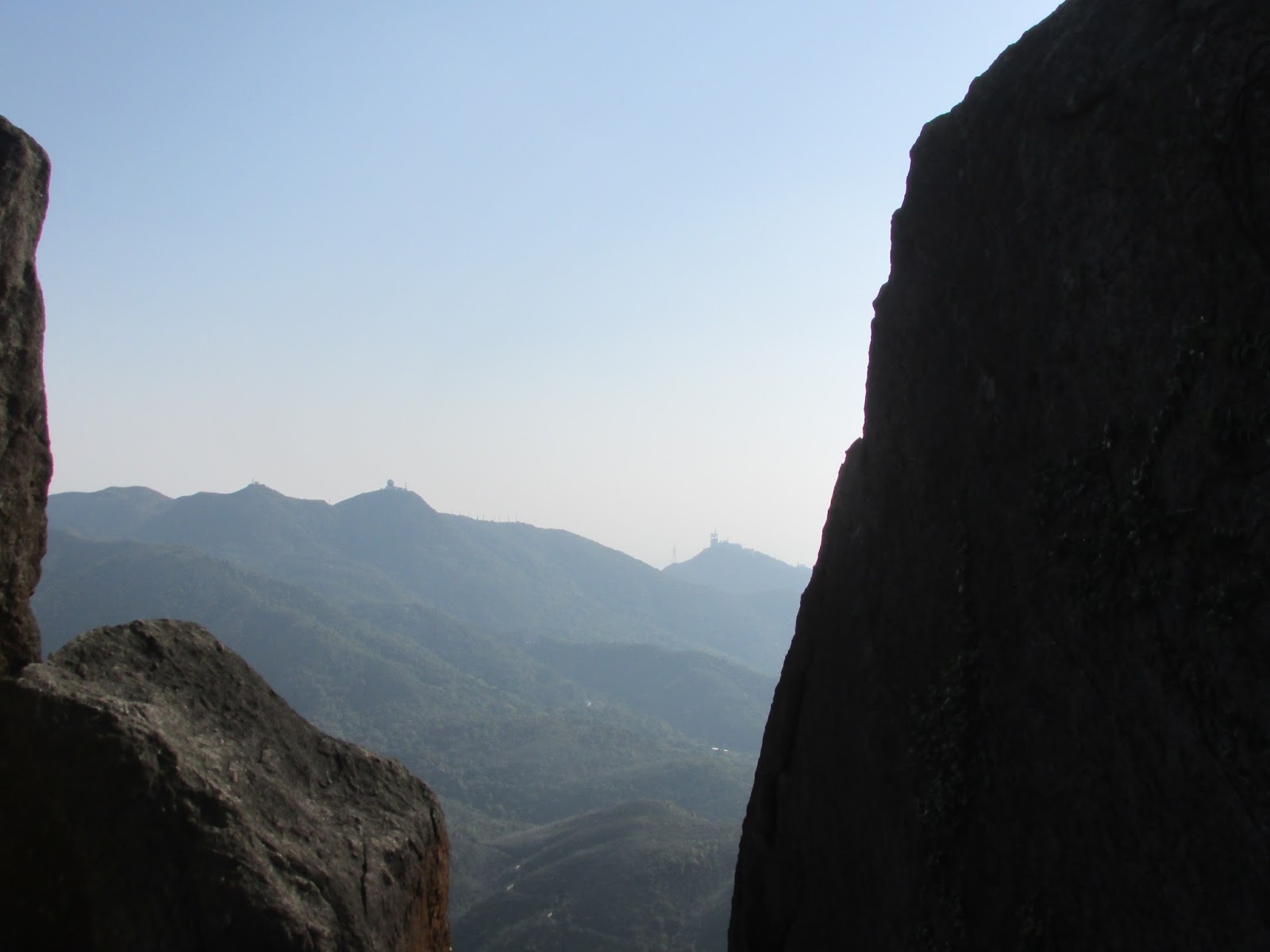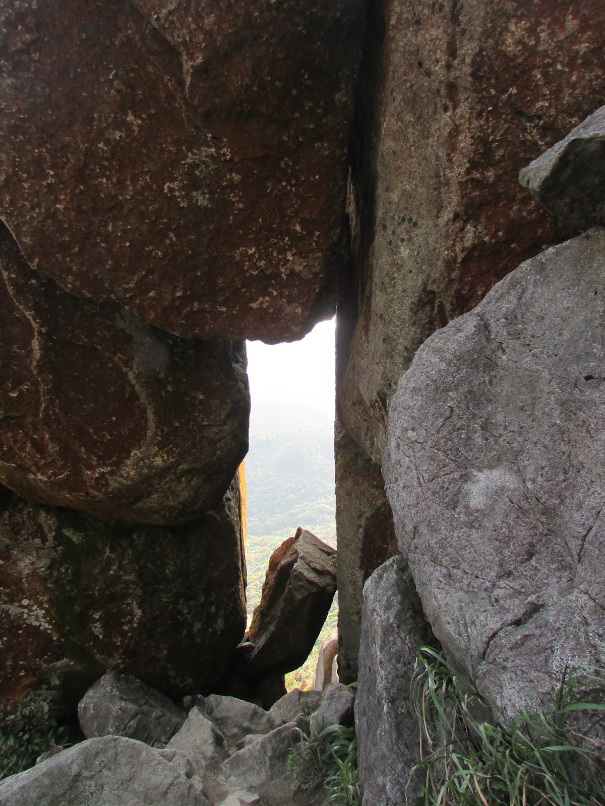 不斷的上攀約150米,終到黃牛石城最著名的景點「天窗石」與「疊石」,那裡的巨石堆疊成一道門的形狀,中間有個完美的長方形空隙,一片斜石就擱在隙中,絕對為大自然的鬼斧神工之作,至於剛才的上山路乃「石窗峽」,石城裡其餘景點尚有「大鳥石」、「獅身人面石」、「七兄弟石」等。到達「天窗石」時剛好來了一群遊人,而且還在石隙裡玩了很久(石的下方已是懸崖),前人一走後人即到,為免攝到他們的身影,繼而被有心人借題發揮之餘,亦嚴重損害他們的聲譽,所以坳仔只好耐心待他們離開,然後才慢慢的拍攝天窗石。那裡位處峽谷,風力頗大,逗留期間要穿衣保暖,攝過「天窗石」後隨即上走至黃牛山頂,山頂上倒是熱鬧。