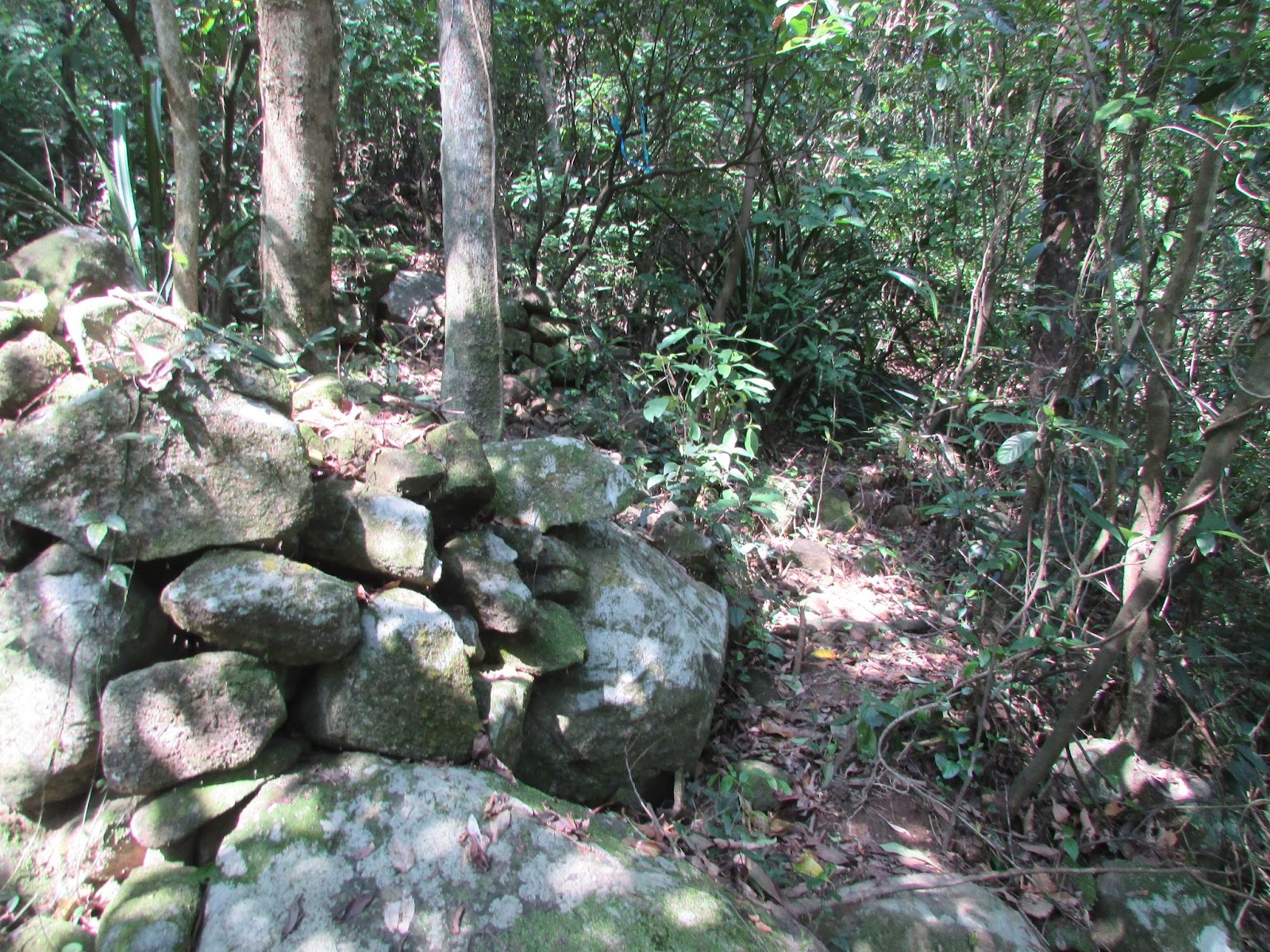 折回大藍湖路,繼續北行至界咸附近,接著轉左沿大腦古道上大腦古村,是相當少數完全以器官命名的地方,據說「腦」字實際只是借字,本字已不知是甚麼,或許用輸入法也打不出來。雖然大腦村因交通不便,所有村民俱遷走,但後人仍為村裡的宗祠加以打理,在黃牛山另一邊的茅坪及石壟仔村亦是如此,另外在宗祠的另一邊(村澗對面)也有兩座磨蔗機,至今仍完整的留著。在大腦村用大腦思考繼續上山的路,在宗祠左邊可上石芽背,右邊可上打瀉油坳,而磨蔗機附近則可東走至企壁山。先試祠右的路,上行一段路邊布滿橫生的竹樹,要不停彎低身子而行,但其後發現已偏離大腦上洋方向,所以原路折回,再從祠左尋路往大腦上洋。