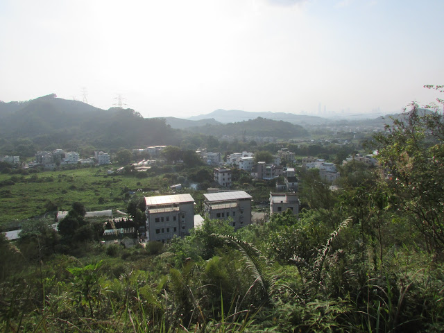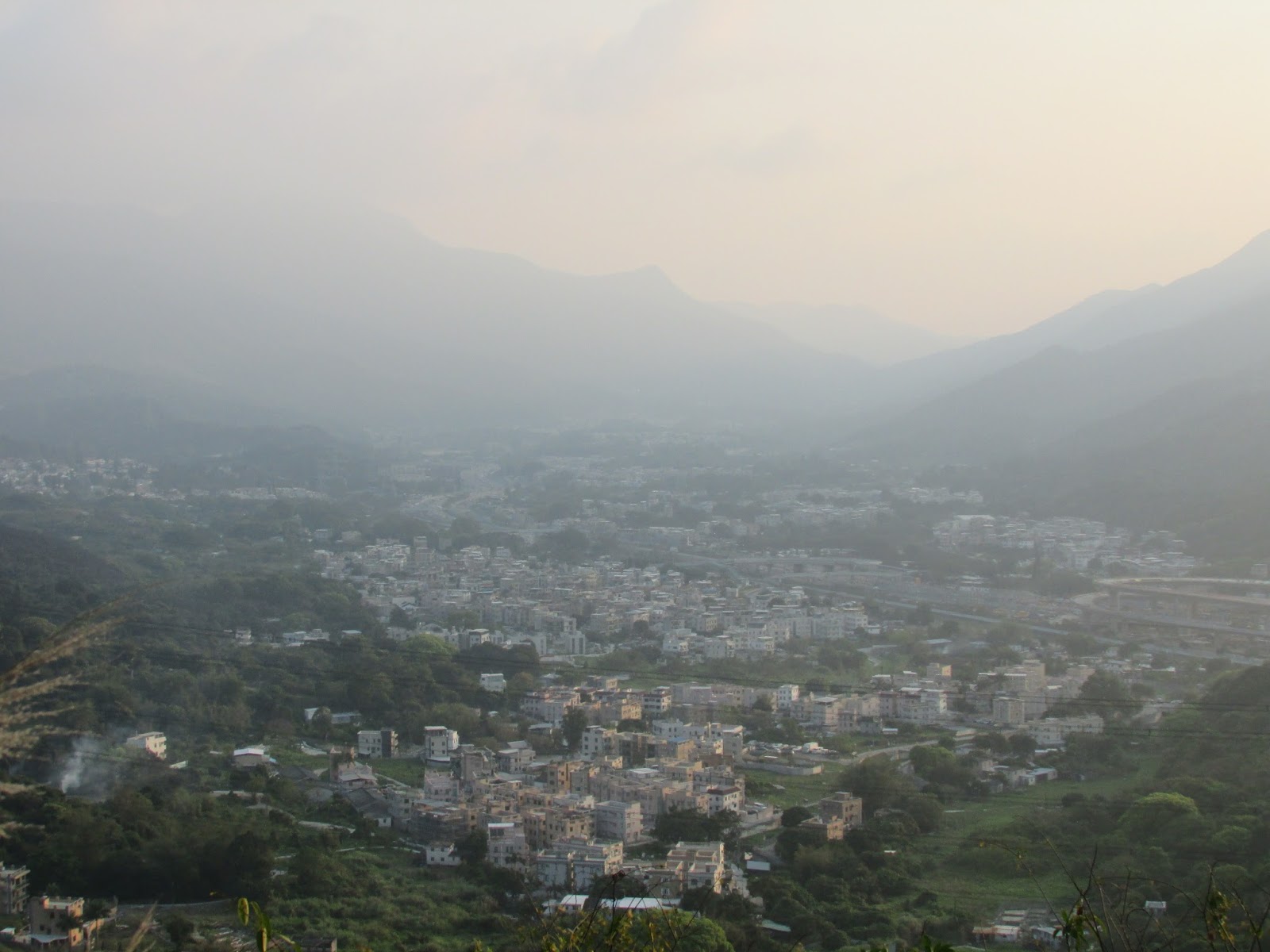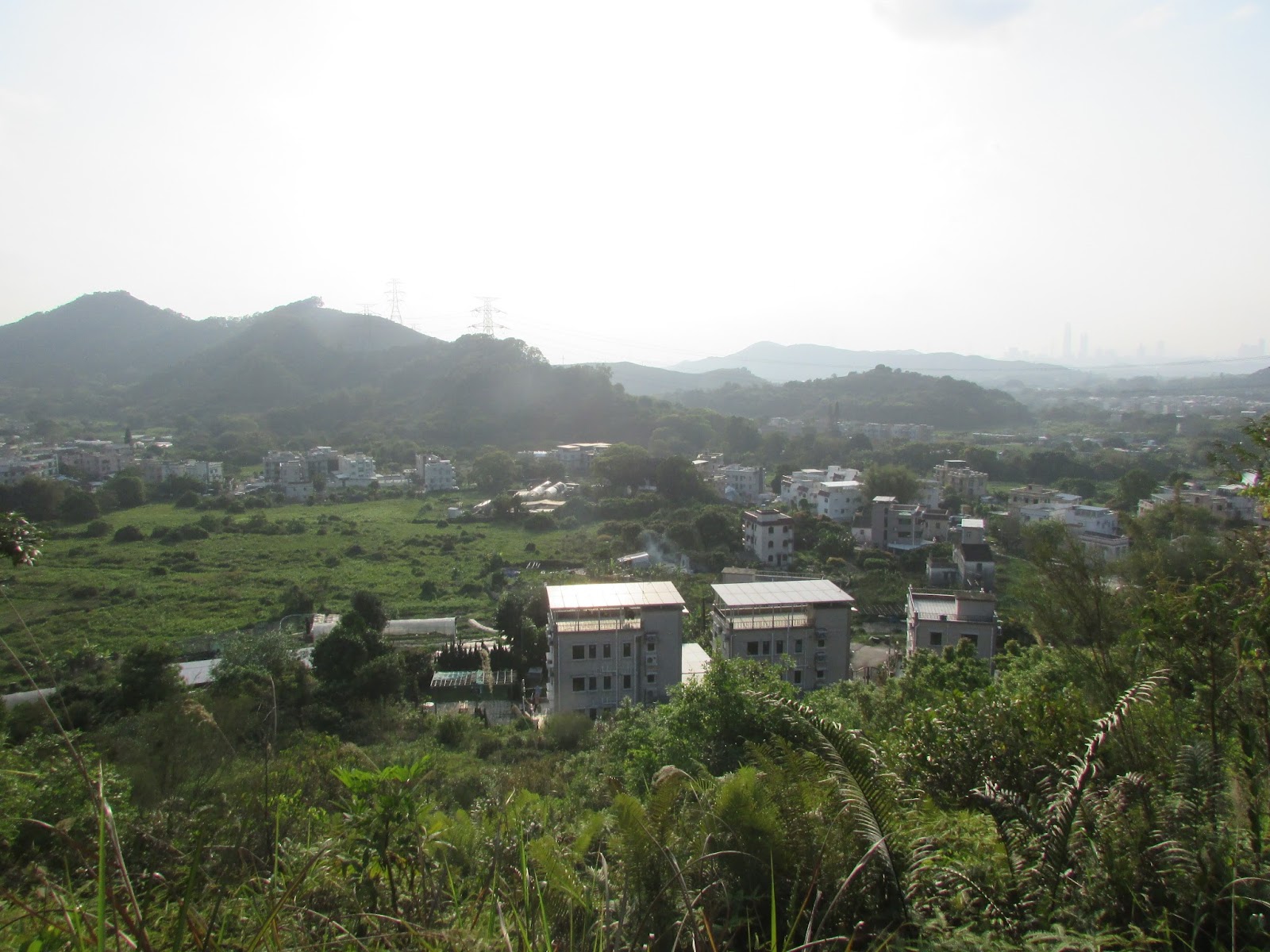 離開老龍田續朝樓梯上行,廿分鐘步程到郊遊徑最高點,那裡海拔約四百米,之後繞經龜頭嶺東南面的山腰,緩步下行至平頂坳(龜頭嶺與屏風山間的山坳)。再沿郊遊徑朝丹竹坑方向前行,途經一處山咀時可走出一座天然的觀景台,近望丹竹坑、鶴藪及沙頭角公路群村等風光,惟是日霧霾仍較重,景物一片矇矓,所以只簡單的看上三兩分鐘。