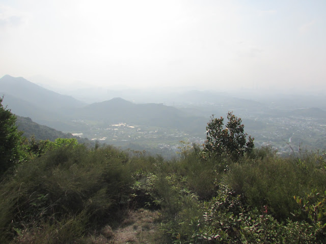 離開老龍田續朝樓梯上行,廿分鐘步程到郊遊徑最高點,那裡海拔約四百米,之後繞經龜頭嶺東南面的山腰,緩步下行至平頂坳(龜頭嶺與屏風山間的山坳)。再沿郊遊徑朝丹竹坑方向前行,途經一處山咀時可走出一座天然的觀景台,近望丹竹坑、鶴藪及沙頭角公路群村等風光,惟是日霧霾仍較重,景物一片矇矓,所以只簡單的看上三兩分鐘。