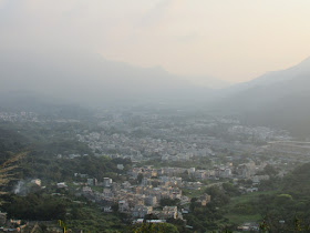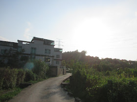 到水塘盡頭處轉山徑,經「流水橋」、「龍山橋」及昔日的雲山下村遺址上桔仔山坳,此時正值日落西山時分,夕陽照射在山下的元嶺及九龍坑群村。沿軍車路下行,廿分鐘步程抵達九龍坑村,本來還希望一探村中的「盤王古廟」,可是古廟位置相當深入,惟恐時間不足,只好下回重遊。