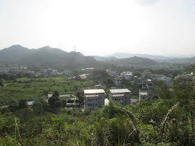 離開老龍田續朝樓梯上行,廿分鐘步程到郊遊徑最高點,那裡海拔約四百米,之後繞經龜頭嶺東南面的山腰,緩步下行至平頂坳(龜頭嶺與屏風山間的山坳)。再沿郊遊徑朝丹竹坑方向前行,途經一處山咀時可走出一座天然的觀景台,近望丹竹坑、鶴藪及沙頭角公路群村等風光,惟是日霧霾仍較重,景物一片矇矓,所以只簡單的看上三兩分鐘。