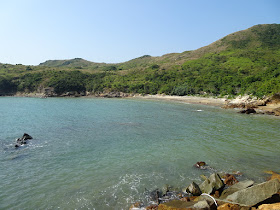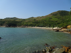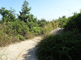 再過十餘分鐘,小徑一分為二,右邊往田下坳方向的野草幾乎茂密得不可通行,左邊路況雖較明顯,但實際直達大廟灣西端的小沙灘,抵達小沙灘時,原來需要綑邊才能繼續前進。是日行程並不包括綑邊,而且看到長山一帶植物似乎非常茂密,在正午時分微熱的烈陽下,如由沙灘直接登上長山並非權宜之計,長山和田下坳一帶秘徑可待日後溫度再降低時慢慢探索。