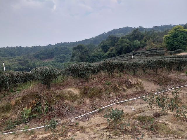 從塘邊小徑穿茶園上茶山頂,路況主要處於叢林及相當清晰,走約廿分鐘就到茶山頂之巔的觀景平台,該處有座名為「茶趣軒」的兩層高觀景亭,不過可能臨近珠三角的工廠群,霧霾相當大,只能看到近處的橫崗水庫,其他地方都一片朦朧,坳仔出境時絕對不是如此。由於能見度實在太差,在亭上逗留不足十分鐘就離開,沿一道中式庭園樓梯下行一、兩分鐘,可見「森林消防應急倉庫」與毗連的宿舍,還聽到有人在宿舍內活動,然而樓梯及倉庫可能受叢林包圍,環境潮濕,外表變得很老舊,原先潔白的欄杆和磚石有大面積發黑,倉庫外牆亦見大片霉斑,但反正不是遊人主要走訪的區域,結構上沒問題就可以了。