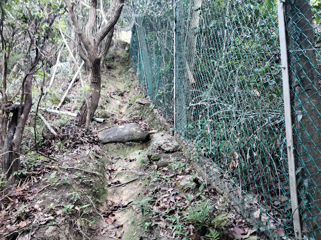 於蛇石坳稍為停留,就走北脊上石屋山,前一次成功上走要追溯至2021年初的事。初段亦偏離GPS地圖顯示的小徑,在植物稍疏處憑零星的路標,接入較明顯的上山小徑。上山前半段部分位置坡度甚高,約在海拔220米的位置,會步經一片充滿侵蝕的泥坡,泥土極度鬆散,每步都不能踩穩,只有拉住旁邊的灌木及樹枝才能爬上去,此時兩旁忽然變成泥壁,再也不能依靠枝木借力,唯有找好一小處堅實的踏腳點精準地跳過去,稍有差池就給滑下山坡。往時幾次走過都不是如此,或許經歷多場風雨,泥坡侵蝕越來越嚴重。