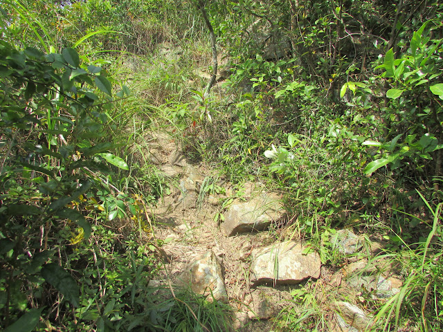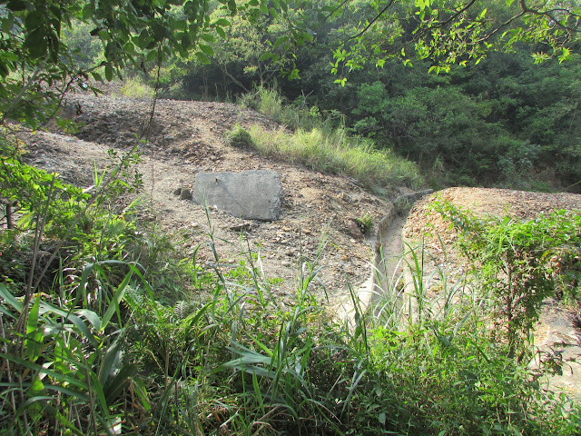 又來到蓮麻坑礦洞了,是次就進入洞內,略攝幾張相後離開。八個月後,再度踏足塘肚古道及連接麥景陶碉堡間的崎嶇山徑。前一晚上網,發現有遠足隊月初才走過此段,故坳仔是日確是放心得多。今年多了人探遊礦洞一帶,現在才是十月,但路況明顯較去年年尾為佳(或因年初有遠足人士墮井喪命的緣故,山界一度對紅花嶺一帶產生戒心,十二月下旬那裡還是滿佈荊棘)。從直升機坪的路口進入崎嶇山徑,廿分鐘後下達半乾的澗道,過澗後就是蓮麻坑村後的荊棘林了。荊棘林裡有無數帶尖刺的野草及藤蔓,在此需非常慢速的前進,且要不時彎身而行,否則很易絆到或碰到藤蔓,繼而弄至遍體鱗傷。亦因路況很亂的關係,如無引路帶帶領,是極易迷路的。在荊棘林及荒田裡仔細的辨認路向,穿插了半小時就到塘肚山村的三層高廢屋。