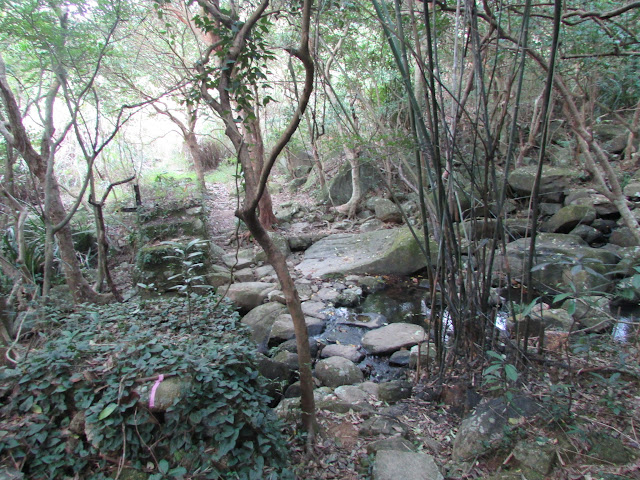 由大水坑站出發,經沉悶的馬路上梅子林村口,那裡有路口上茅坪,不過是日不走此路,改走左邊的引水道馬路,不遠處正是上石壟仔的小徑入口。初段是非常狹窄的水泥徑,而且下面的護士牆越來越「高」,像是走在懸崖般,最後穿過一道樓梯上山路。初段可聽到梅子林村的犬吠,而且吠得很兇,加上村內已變成私人重地,相信那裡是個守衛森嚴之地,還是避免單獨行走「梅(子林)花(心坑)古道」。上山途中有不少支路,不過沿石砌步道或最多引路帶的路走,加上自己的方向感,半小時內到達已荒廢的石壟仔村。
