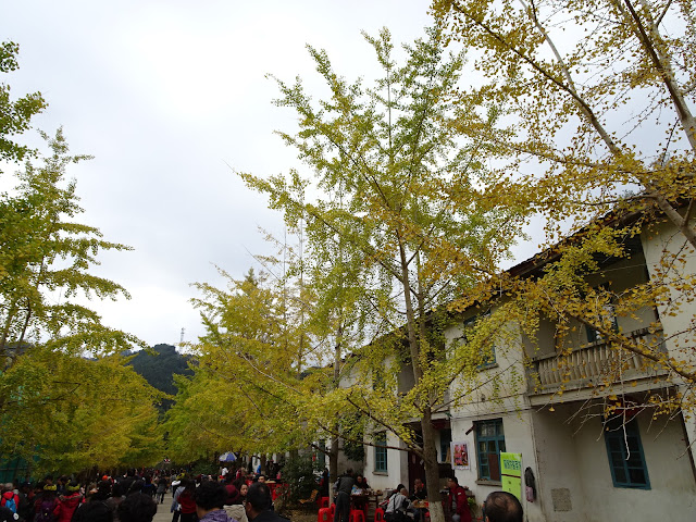 在黃金大道穿梭,期間進入「峰林學校」原址,廣場裡同樣有密度甚高的銀杏樹,繼續盡情留影時,發現附近有一石磴路上山,在較高處開揚處的野草群中,同樣可見一些葉片極黃的銀杏樹,只是難以靠近,相信本身是當地野生的,後來村民為推廣旅遊再加以種植。