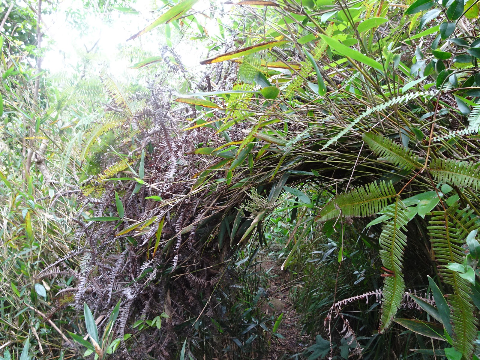 循例在尤德亭攝了幾張照片,經濕滑的古道石面繼續上行,穿過已荒廢的下七木橋村,進入橫山腳的高台廢田地帶,當前時間尚早,途中遇上一些小野豬在路邊覓食,但牠們很快鑽進草叢中。抵達連接黃嶺與新娘潭之間的十字路口時,可見八仙嶺一帶被霧層覆蓋,相信是日登高賞景並不太理想,不過也沒關係,因為當前已差不多屬全日行程之最高點。橫山腳上、下村均已荒廢,屋舍明顯毀爛,在叢林下更覺陰森。橫山腳廢村一帶沒有被「山竹」顯著破壞,陰森氣氛仍然維持,除附近的橫山腳南橋塌樹較多,但已悉數移走。