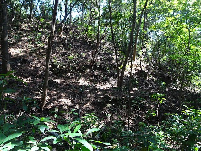 踏上往牛寮及荃錦坳的山徑,環境充滿樹蔭,相當舒服,路邊還隱藏一些被雜草嚴重覆蓋的梯田殘片。在半明顯路口左轉深入牛寮,境內有三個牛寮,兩個都屬西貢的小村落(前一天已走完),而荃灣的牛寮感覺虛無縹緲,但地圖標在荃錦坳南面海拔近400米的山窩,山窩裡絲毫沒有村落痕跡,僅發現一些零碎梯田殘片,地面蓋滿枯葉和斷枝,探索時斷枝不停受踩踏而發出清脆的碎裂聲,厚厚的枯葉和斷枝中不時看到黑色的牛屎,倒是沒起錯名字,現場確是牛的居所,不過是日在山窩逗留超過兩小時始終沒遇到牛出現。