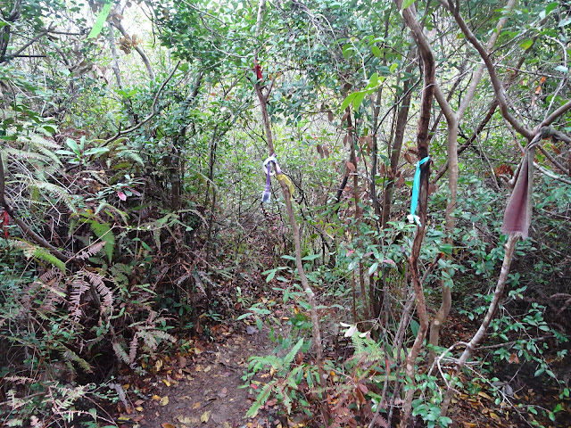 在鹿湖峒離開船灣淡水湖郊遊徑,往後至黃竹角咀都屬密林小徑,先是高度相若的「跌死狗」,隨後雙手並用地急降鳳凰笏頂之間的山坳,陡峭得連狗也容易墮斃,故名「跌死狗」,但非正式地名。山坳有路口可讓遊人從黃竹角咀回程時是否登上「跌死狗」,或經南面山腰往鵝髻頂附近,最近更有遊人在往黃竹角咀的路口掛上自製的鬼手路標,容易使人辨認。在灌木密集的鳳凰笏頂、白角山、昂莊山前往大嶺黃竹角墩台,當中鳳凰笏頂海拔近200米,白角山海拔205米,地勢隨後逐漸下降,昂莊山支路稍多且地面岩層變成艷紅色,至於大嶺亦有一座測量柱(海拔152米),去年二月黑漆全部脫落,現已翻新,坳仔盤算著維修測量柱的工人究竟怎樣出入。坳仔起步時已近十一點,遠遠晚於遊人一般的九點前,直至白角山附近才開始追及前面遊人(郊遊徑遇到的相信不是「環湖出咀」),亦陸續有遊人從黃竹角咀回程,整體較預計為多,沒太受清晨突如其來的降雨影響。