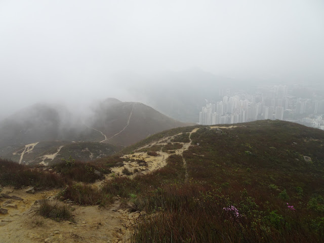青山頂別稱「杯渡山」,據聞南北朝佛教僧人杯渡禪師曾在青山禪道兼居住過。在濃霧的山頂「打卡」後正式踏入行程核心,沿長約七公里半的山脊線前往另一面的圓頭山(別稱「靈渡山」)。折返「韓陵片石亭」,先經北面副峰另一座呈迷彩狀的微波發射站,斜度很快轉急,但同時很快脫離霧層,視野隨之回復開揚。就這樣下了超過四百米到達有馬路連接的良田坳,境況絕對讓坳仔驚奇,相信沒有其他地方的居民更懂得在後山發揮小宇宙,想起《IQ博士》兒歌的「創作力量同幻想會嚇你一跳」,山坡菜田耕地恆河沙數、路邊無窮無盡的小寮,還有健身單車與沙發等重型設施,通往乾山的山徑更放了多張精緻的石台(方便坐下休息),每天黎明時分良田坳附近隨時比旺角更旺,日間大部分時間也迎來不同類別的遊人,偶爾有騎越野摩托車的。 值得一提,如在良田坳的馬路繼續上行,上行小段後最終會經過「大峽谷」下下白泥。