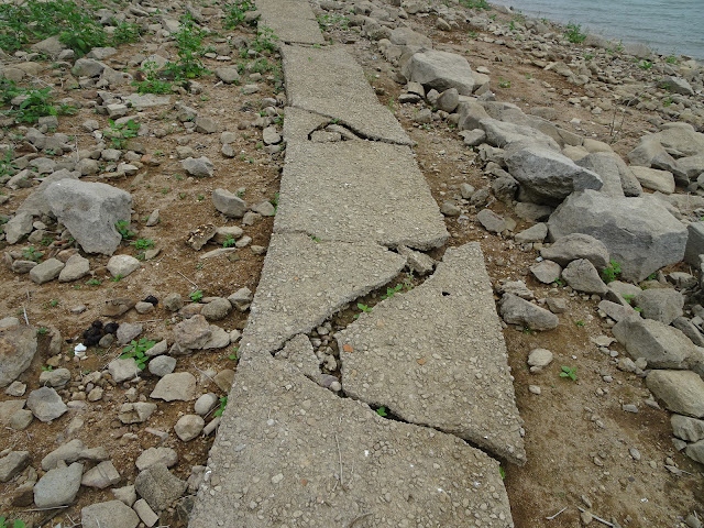 橫嶺背村規模明顯較橫嶺頭村細小,但如同橫嶺頭村石堆中混雜一些屋宅磚瓦殘片,想起九龍半島的鑽石山——讀歪點就是「磚石散」。其中一角地面刻上「Tai Loon Village」字樣,又稱「大龍村」,可能取自上面的大峒。此時已是兩點,該要趕路,從橫嶺背至金竹排的斜壁路段感覺有點沉悶,隨路面轉為平坦,代表已抵達金竹排村遺址。金竹排村規模較橫嶺頭村略小,但面積相當廣闊,遠方更有牛群吃草,地面再也看不到任何垃圾蹤影,使人置身世外桃源。那裡的牛隻可能太長時間沒看過人,早已產生高度警戒,向我們凝視至正前方為止。在金竹排探索期間會發現獨特的村落痕跡,例如通往高處的樓梯,不過上面已被塌樹藤蔓覆蓋,乍看也不見廢屋殘片。湖邊某深處更發現斜坡登記編碼牌,看電話號碼肯定是九十年代之後的事情,政府應有特別原因要在湖邊另建護土牆,當然日久失修加上長年累月處於水中,護土牆崩裂了。