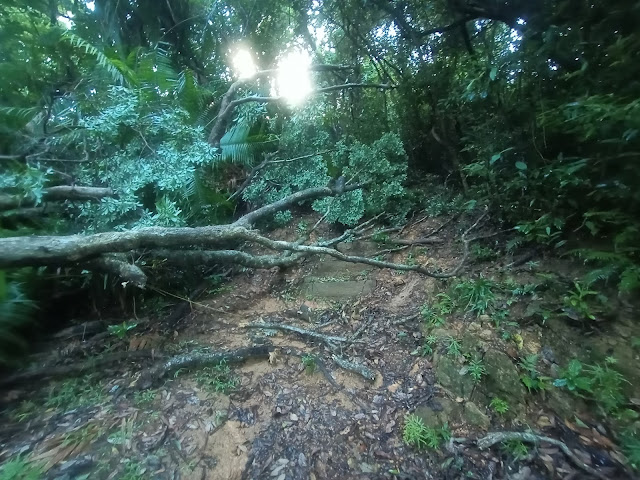 將近谷埔上空快速恢復晴朗,因為一般局部地區對流雨持續時間通常不長,熱力釋放完雲層立即消散了。往榕樹坳路上再次聽到幾次悶雷,因為深圳龍崗正有發展旺盛的熱對流,然而方向在遠離,不會構成潛在威脅,另外初段攔路的樹木與枝葉仍在。半小時左右步程到達榕樹坳廢村,景況有點嚇人,不過並非「時值」的靈異事件,而是風暴後水窪處處,無法避開——除非原路折返。此時已過四點,離退盡不足一小時,汲取上次經驗,加上是日山徑路況可能很差,看看綑岸經三角咀及長排頭會否快一點。
