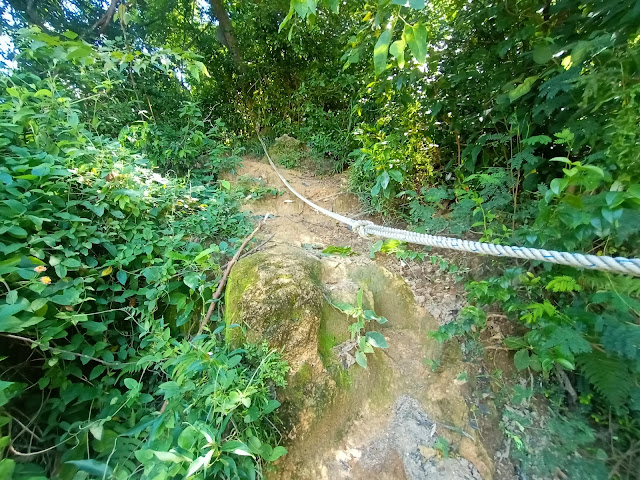 看畢「馬鞍」後藍天白雲下的馬鞍山及鄰近地區,就沿小徑下大埔滘林道,此段林道一走就走了大半小時,但整體路況趨於向上,此時看到一個車輛調頭處連地圖板,身邊被一片竹林包圍,此乃打鐵屻脊入口了。看地圖此脊相當陡斜,但感覺上又不算,可能因為打鐵屻村最高點所在的觀音宮海拔達二百米,所以此脊落差沒比想像中大。過了一片竹林及電塔底後見一小片草坡,也是全脊唯一看到風景之處,可俯瞰大埔新市鎮一帶,後段深入叢林,小心爬下田基就要穿過打鐵屻右坑(碗窰河上源之一)的兩支澗道,但水非常豐盛,雨季難以避免涉水,過澗後立即到達打鐵屻村觀音宮,略作整頓就繼續下山,先經賴氏宗祠與一排舊村屋,隨而抵達馬路及村民聚居的新村屋,再快步離開碗窰範圍,穿越大埔墟及太和邨到達大埔頭村。