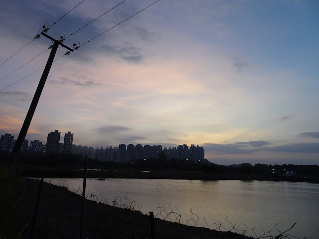 全天只有幾秒踏足麥徑九段,不過當刻正是全天最高點。在對面沿「河背」指示牌下河背水塘,先是崎嶇的樓梯,再是可走得很爽快的越野單車徑,接近河背水塘一段郊野徑與越野單車徑分隔,但接近平排,可是坳仔過往幾次沒留意到,錯走了越野單車徑。穿過河背水塘具特色的S字水壩,此處在元朗最南端,要走至區內最西北端的尖鼻咀估計還要至少兩、三小時,所以也不按原定計劃上井坑山落錦上路站了,直接下河背村,再一直走錦河路、錦田公路至元朗市中心外圍,途中步經八鄉車廠、錦上路站及凹頭。此時身體疲態越來越明顯,腳掌亦出現酸痛感覺,也要繼續憑意志走下去,因為時間沒多。