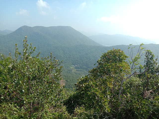 從鐵矢山頂觀看西貢海近西貢墟的群島風光,以羊洲最接近西貢墟,黃竹灣海面亦有多個無名小島,在潮退下更形成沙堤互相連接。聽著龍舟賽鼓聲大休,可惜空氣質素頗差,比賽場面看不清楚,似乎端午節通常擁有高能見度的天氣下才較佳。半小時後才經北脊下行,路況較兩年前明顯得多,不過植物卻有少許水珠,小徑亦有少許滑,似乎前一晚非常潮濕,加上Dew Point上升,樹林裡的水份還沒及蒸發。穿過山坳,走一段古道抵達黃毛應村,現時規模細小,貌似很平凡的山村,不過二戰時卻是軍事據點,當時東江縱隊港九大隊(抗日游擊隊)在村裡的天主教玫瑰小堂設立。