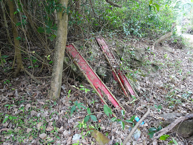 359山頭稍北處有座電塔架,無論官方地圖還是GPS地圖均顯示塔架以北往白石橋之小徑稍為斷開,當然也得探索一下,若可通行就能節省不少步程,反正時間已不早。果然願望成真,穿過乾溪就接回地圖標示之小徑,惟該段斷開的小徑植物頗為茂密,要花幾分鐘才找到入口。地勢趨於向上,環境均深藏叢林,中段又見支路,左路稍為偏離白石橋方向,而且上坡路段更多,當然就選右路,整體坡度相對平緩,其中一處還有疑似古道痕跡,究竟往日有沒有古道往來上花山與白石橋之間?