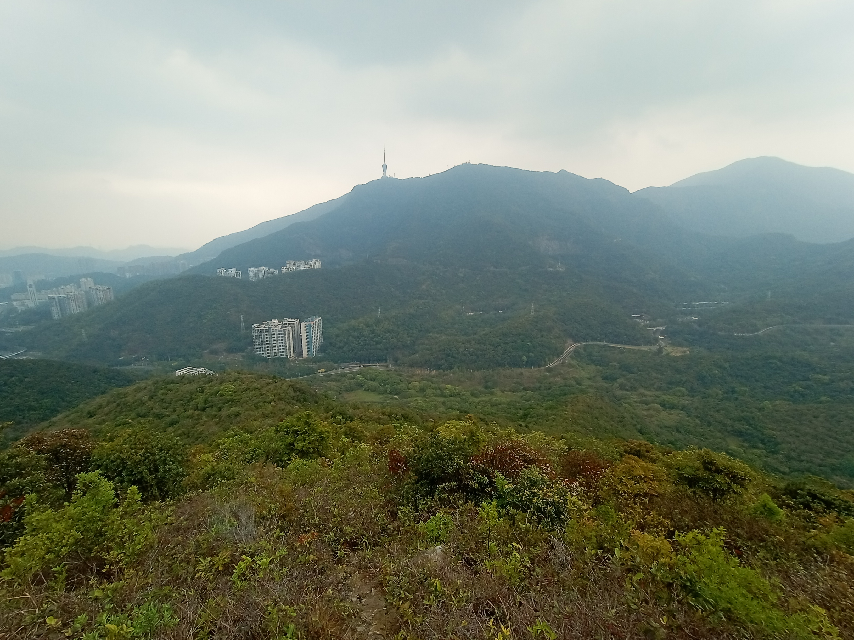 於擔水坑巴士站起步,先經山咀村路上行至高點,再左轉進入通往紅花嶺及蓮麻坑礦洞一帶的山徑,並快速上行,初段的日軍戰時遺跡包括機鎗堡、水井、戰壕等,坳仔已攝過很多次,所以沒有刻意深入遊覽。從山咀上「亞公頂」昔日英軍瞭望台的路段已明顯擴闊,記得六、七年前過了日軍戰時遺跡附近的山墳後已是密林小徑,後來晨運人士把山墳至海拔約200米電塔處之小徑擴闊,如今接近瞭望台段更有新建樓梯,不過發現樓梯自上而下修建,可能工人進度上想「先苦後甜」?尤其幾個月後就是炎夏,希望工作時可節省一些體力。接近瞭望台時坡度最高,加上天氣溫暖,體感顯得炎熱及辛苦,樓梯附近還有兩根用以扶手的繩索。