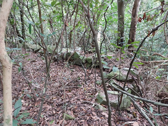 過往兩次到訪石水澗,都找到廢村遺址,不過純粹外圍罷了。近來未知是否因電台被掃蕩剛好八十年,就在上月中東江縱隊歷史研究會到過石水澗村,出入小徑重新被打通,亦可深入廢村探索。廢村仍有少量頹垣半壁及底座。由於石水澗村荒廢年期久遠,屋宅邊界有點模糊,但仍可辨認出由一排五、六座村屋組成,與村民描述的資料大致吻合,而屋宅建於石砌垣牆上。於廢村東端接回澗道,嘗試走至盡頭接九擔租與橫嶺坳之山徑,周邊不見任何古道相關痕跡,坳仔很疑惑究竟村民如何出入,比更偏遠的馬尿、烏洲塘村還神秘,當然沒可能從九擔租沿澗穿石墜下瀑上行了。