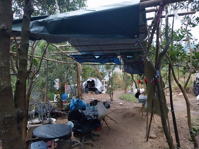 接近礦場馬路時,竟然經過兩片晨運客蓋成的小寮,還種了一些蔬菜(註:請勿偷取蔬菜或小寮裡任何物件)。到達馬路,攝下針山山腰的露天礦場遺址,雖然規模不算太大,形態也有幾分震憾。時近入黑,快步沿馬路下行回程,路上有幾處出現相信是去年九月「海葵」世紀暴雨帶來的巨型塌方痕跡,其中一處更變成天然山徑,而下城門水塘對側的「鐵索迷城」一帶山坡亦有類似情況,似乎當時的暴雨就新界中部的山野影響甚大。