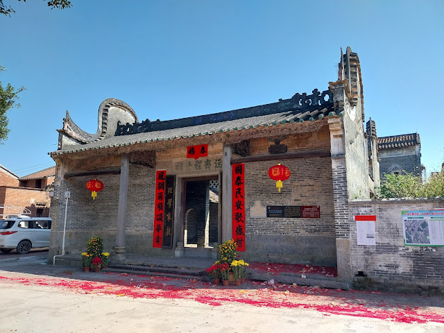 十點五十五分到達雲浮東部、鄰近肇慶及譽為「嶺南理學第一村」的水東古村,包含長流、大塘等自然村。古村建於1404年(明初時期),歷史超過六百年,據說由祖籍安徽、後遷河南的北宋理學家程顥後裔建立。理學家所指的「理學」當然不是現今慣指的自然科學,而是哲學上推崇天理(陰陽二氣的運行節律)的主張,認為宇宙萬物皆只有一個天理,而且道德主張與天理相互聯繫,歷史上程顥成為近代復興儒家文化的重要人物。古村裡的明清古建築達588座,包括一座古廟及十座祖祠,具備獨特的理學文化底蘊。坳仔沒有如此高的哲學層次體會箇中的底蘊,只知是日為大年初二,村裡充滿濃厚的節慶氣氛,多座屋宅前遍布鞭炮碎片,遊覽期間亦聽到村民近處燃放鞭炮時發出的清脆響聲,遠處更聽到舞獅表演。