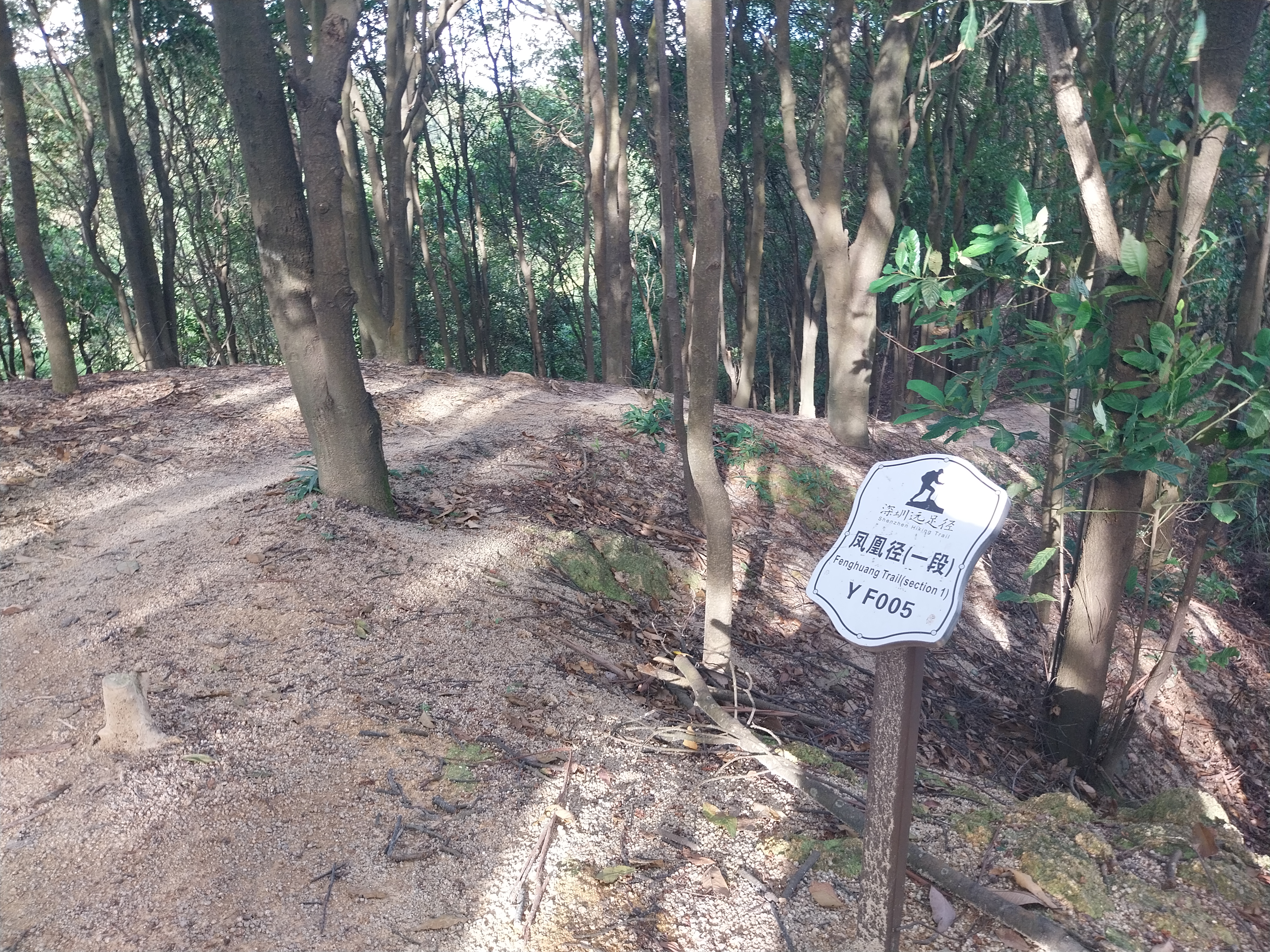 跨過被圍欄隔開的路口,該處設YF001標距柱,先有指示牌標示前路為「黃麻布一線」,隨後路段均持續屬天然山徑,直至南光高速附近農村道路為止。在YF001與YF002標距柱之間有座山坳路況極為陡峭難行,夾雜大量浮沙碎石,而且更有歧路。路上整體景觀不多,幾乎全被參天喬木覆蓋,當過了YF006標距柱,可見一個支路相當多的山坳,可通往阿婆髻或七瀝水庫等地,對如此地方絕無認知。由於是日的目標為走完鳳凰徑第一段,故選「鳳凰線」向東北重新上山,入口僅「深圳遠足徑」相關簡介牌記認。