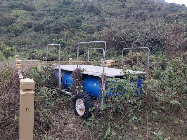 走了一圈,離開高流灣,前往約五至十分鐘外的蛋家灣。是次路經時,村裡十分寂靜,原有的戒毒中心乃屬聖伯多祿小堂所有,因受「山竹」破壞而關閉,後來得以復修。稍為退回,於公廁側草坪背後翻上山坳,然後沿山腰的水管路往蚺蛇灣。山腰近一兩年有鋪設新水管工程,根據去年遊記描述:「水管路近蛋家灣半段都標註了「GLA-TTP (STLA TP2518)」,當中GLA為政府撥地、STLA為簡易臨時撥地,至於TP應為大埔的簡寫」,相信工程乃屬水務署為大埔區蛋家灣一帶鋪設新水管,惟現時網上地圖的標註已消失。是日並非假期,不單不見任何工人,甚至連蜘蛛絲都碰到好幾次,只有零星雜物及沒有遮蓋任何東西的圍欄堆放,似乎工程進入尾聲。