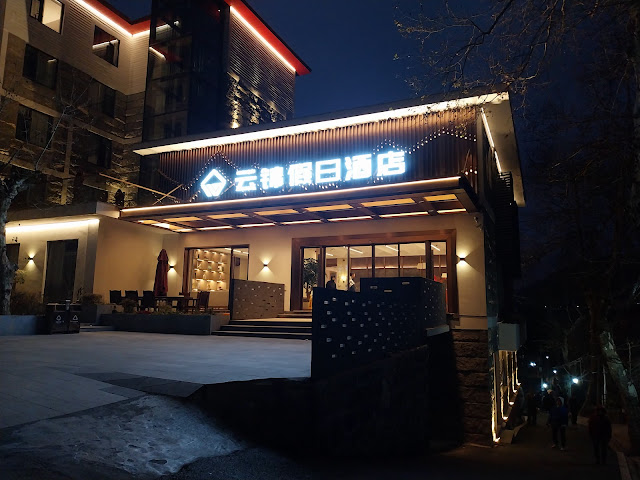 在錦繡谷與仙人洞閒逛了超過一小時,再乘景區旅遊巴回酒店餐廳晚飯,由於天陰關係,五點半就開始入黑,而且亦感受到溫度的明顯下降。飯後回到酒店房間休息,但在九點左右再外出閒逛一會,此時氣溫下降至僅2至3度,牯嶺鎮街巷逐漸變得冷清,約半數商店已打烊。