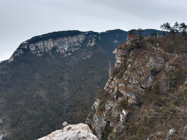 花徑公園與如琴湖一帶的看頭並不多,半小時就參觀完成,隔個馬路就進入錦繡谷園區。錦繡谷早於1980年就被開拓,相傳為晉代東方名僧慧遠擷採花卉草藥的地方。雖然擁有一個美好的名字,走在被開拓的長約1.5公里步道上,倒有一種刺激的體會,因為怪石、峭壁、斷崖、險峰匯集谷中,一不留神就會掉進百米深淵,「真面目」與想像完全是兩回事,皆因山谷由冰川的反復刻切而形成。沿崖邊步道前走往出口的「仙人洞」,走至近出口時更間歇可見猴群,習性跟香港郊野公園的猴子同出一轍——一見遊人手持膠袋就去搶食,坳仔親眼目睹前方的內地遊人就給「中招」,被一頭猴子搶去袋裡的橙,「遇害者」苦中作樂地攝下其「罪證」,不久後附近幾頭猴子就來分甘同味。